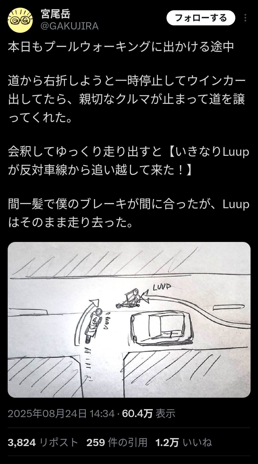 【悲報】X民「優先道路で車が止まってくれた!ラッキー」LUUP民「前の車止まったから追い越したろw ブーーーン💨」→