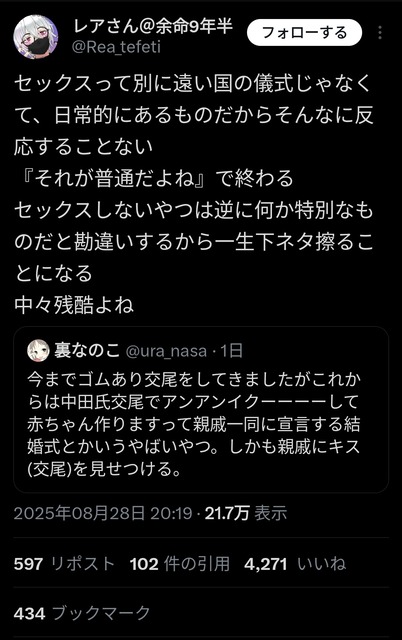 中高生とかならわかるけど大人ってだいたいセ●クスしてるしまあそんなもんよな