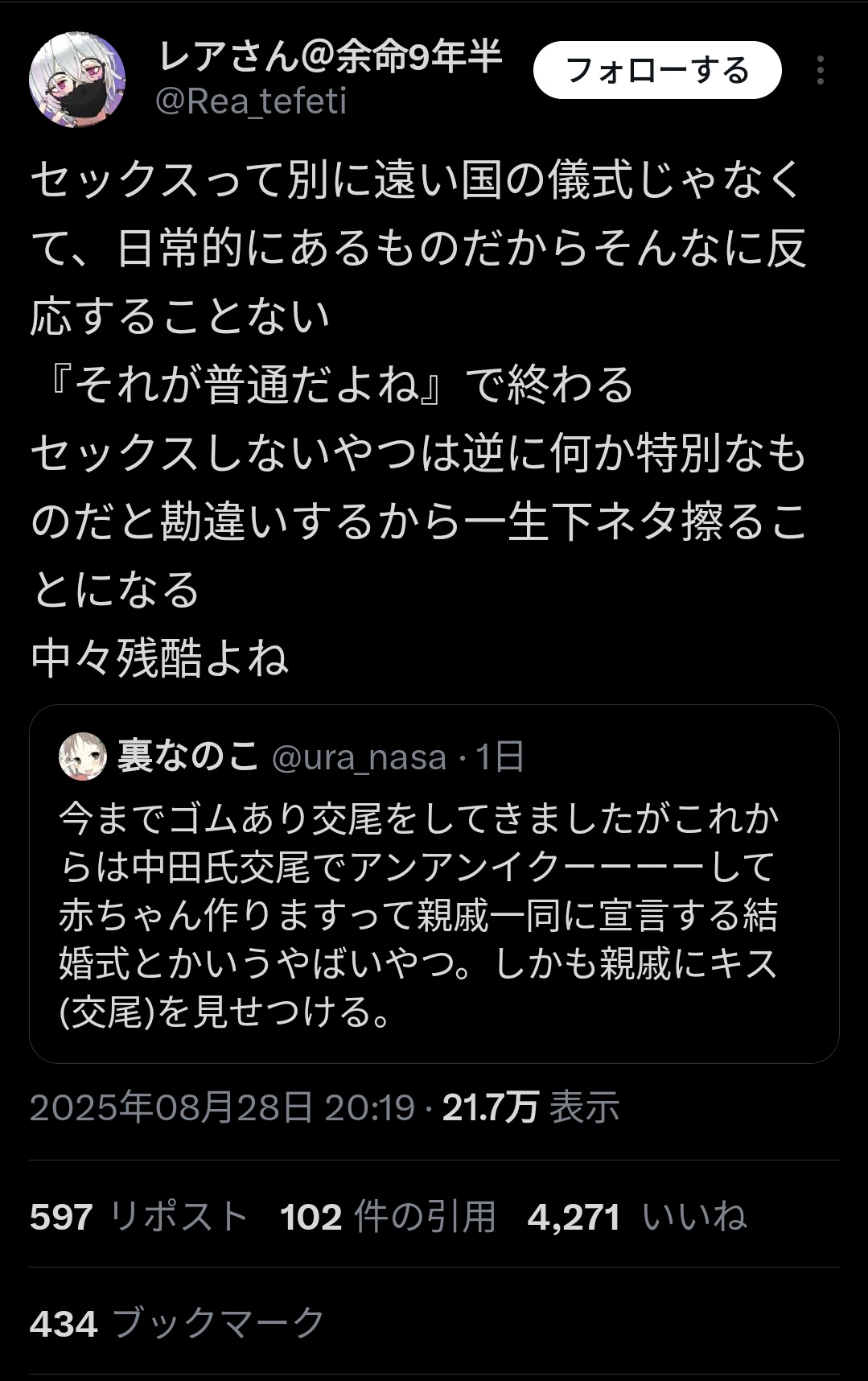 中高生とかならわかるけど大人ってだいたいセ●クスしてるしまあそんなもんよな