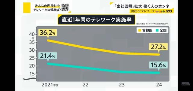 「(テレワークは)隙間がなく、ウェブ会議が敷き詰められがち。今は会議室の移動がある。あれ最高に良いなって思って」直近の1年間でテレワークをしたことがある人の割合は、国交省が調査を始めた2021年が最も高く、その後は右肩下がりで推移しています。