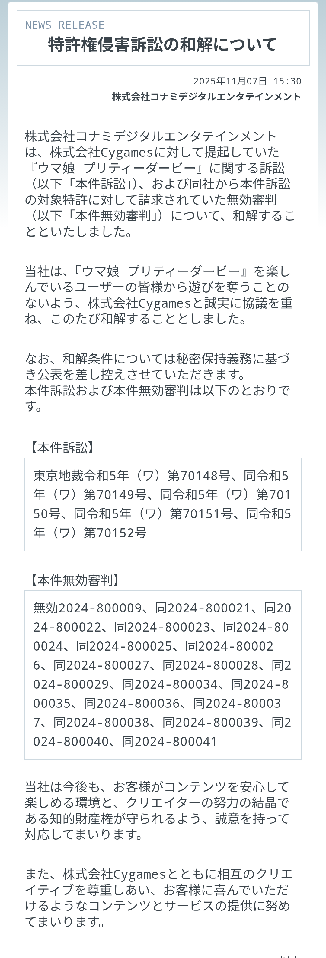 株式会社コナミデジタルエンタテインメントは、株式会社Cygamesに対して提起していた『ウマ娘 プリティーダービー』に関する訴訟(以下「本件訴訟」)、および同社から本件訴訟の対象特許に対して請求されていた無効審判(以下「本件無効審判」)について、和解することといたしました。