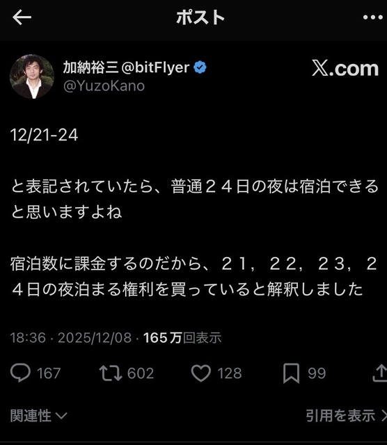 男さん「ホテルで12/21-24と表記があったら24日も宿泊できるよね?」x民「」シュバババ