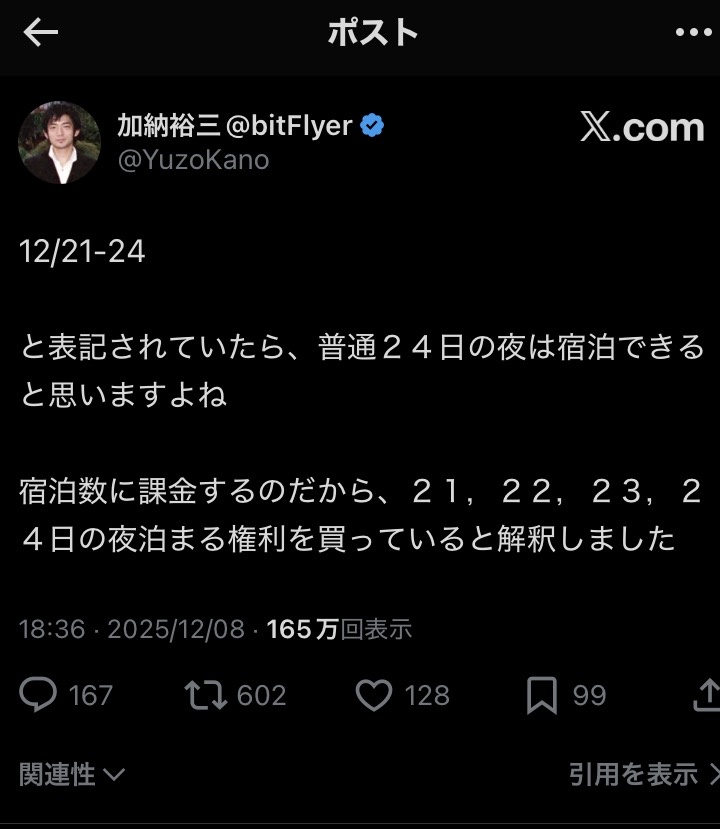 男さん「ホテルで12/21-24と表記があったら24日も宿泊できるよね?」x民「」シュバババ