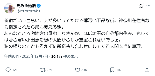 マチアプ女「出た『新宿』…おのぼりさんと埼玉県民だけがありがたがる小汚い街…」