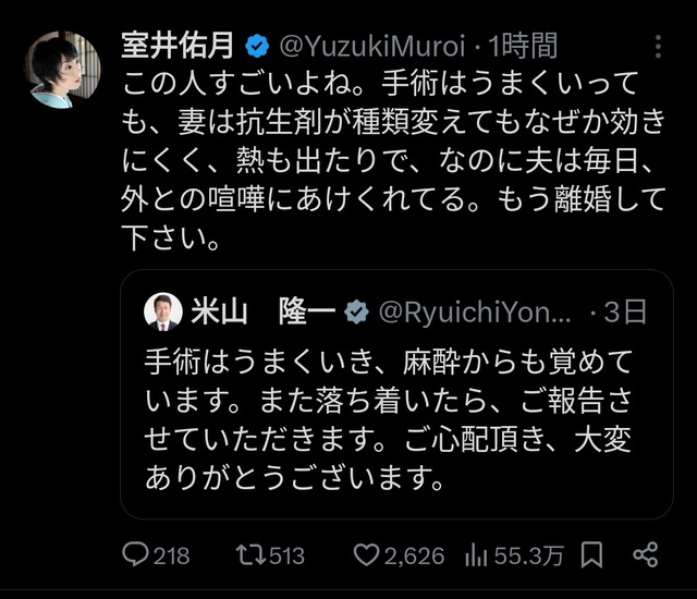 この人すごいよね。手術はうまくいっても、妻は抗生剤が種類変えてもなぜか効きにくく、熱も出たりで、なのに夫は毎日、外との喧嘩にあけくれてる。もう離婚して下さい。 https://t.co/avjAjqeXJy