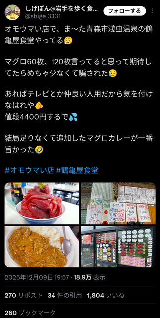 — しげぽん@岩手を歩く食欲&アルコール夢中マシーン (@shige_3331) December 9, 2025