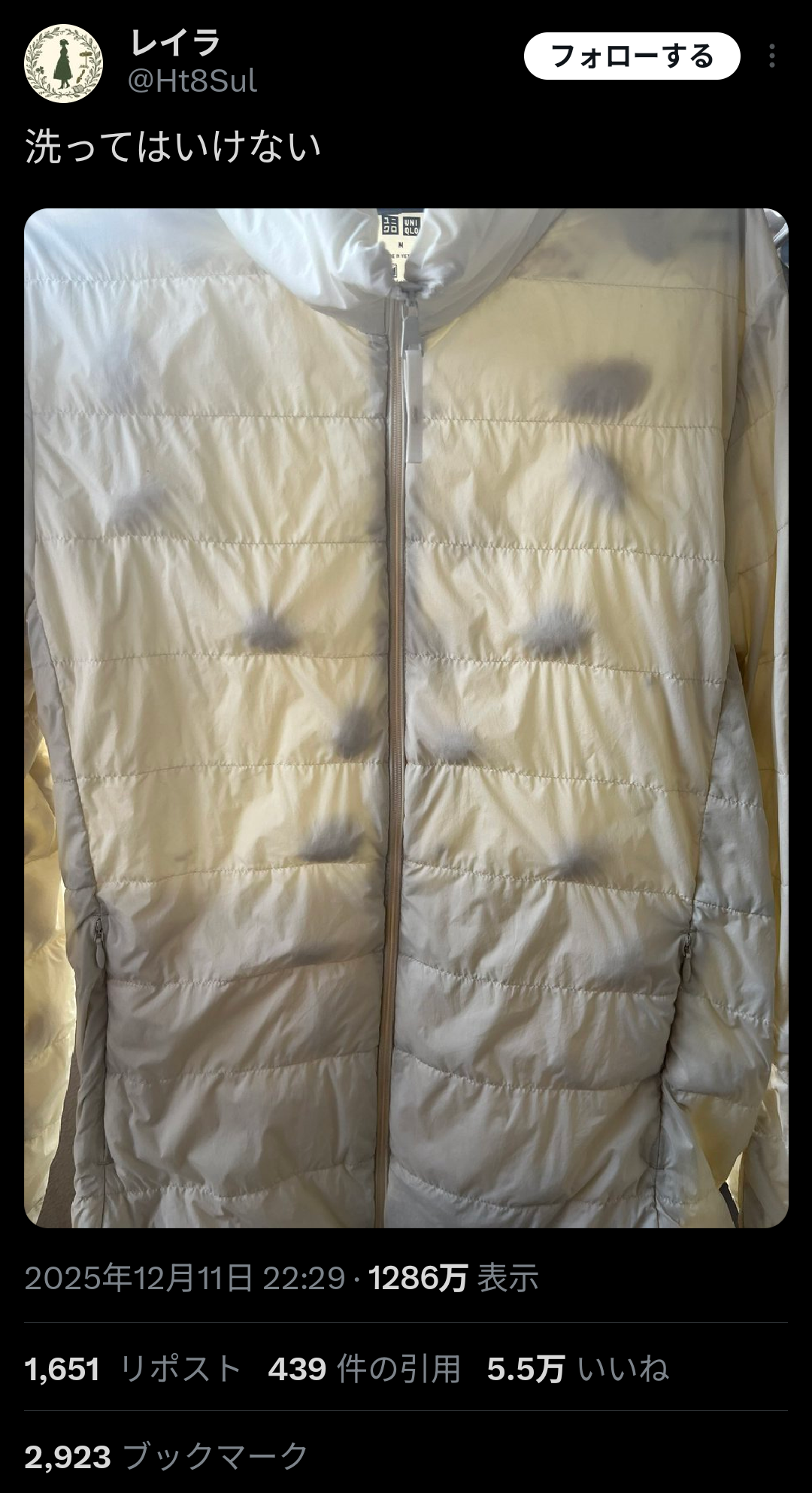 【画像】洗濯されたユニクロのダウンジャケット、やせたかなしい姿になってしまう・・・・・
