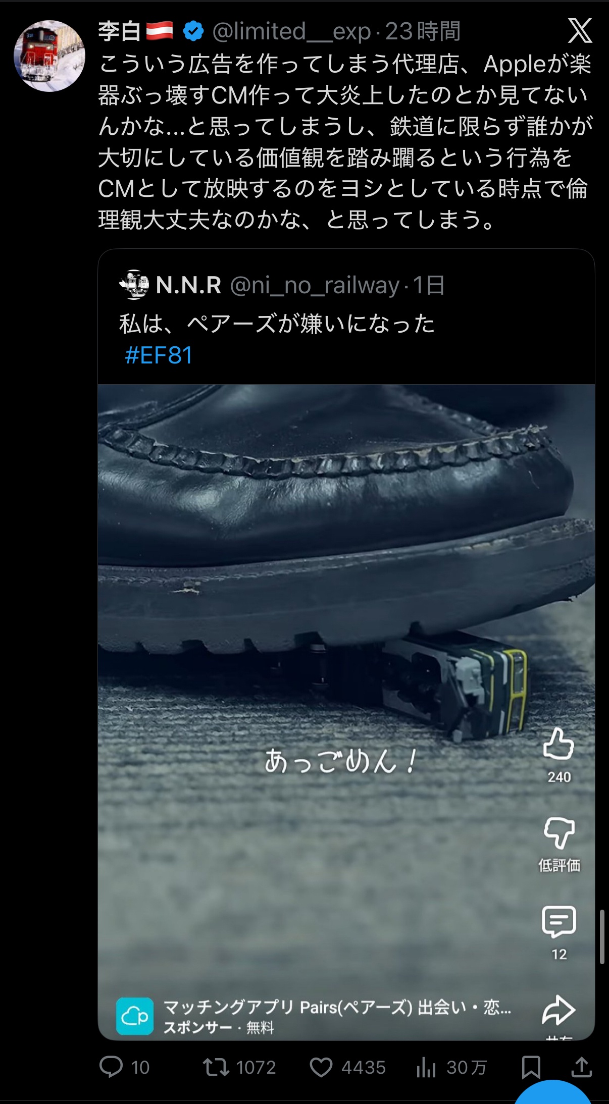 【朗報】鉄オタ「こんなことするなら、二度とペアーズは使いません」