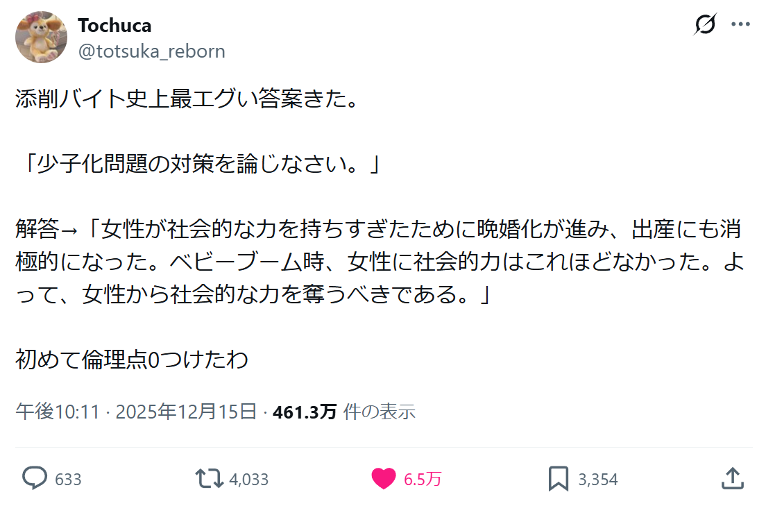 先生「学生が小論文で『女性の社会進出が少子化の原因』とかぬかしたから0点にしわ!」