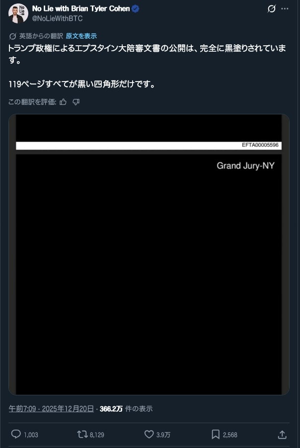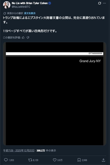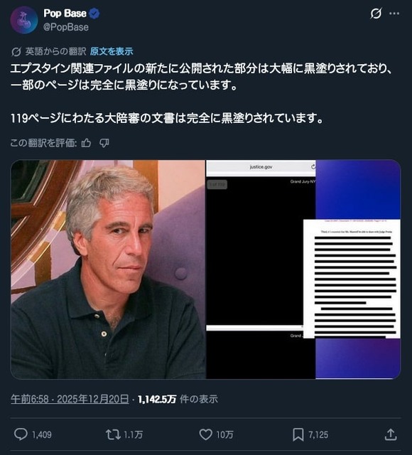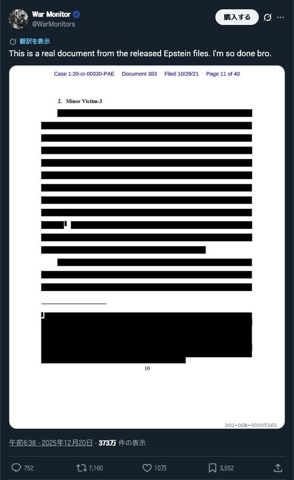 【画像】トランプ政権が公開したエプスタイン文書、日本人もびっくりの黒塗り『のり弁』状態wwwww