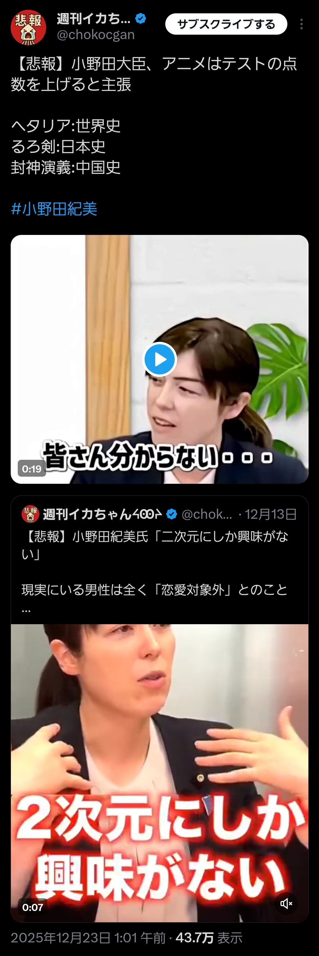 封神演義:中国史#小野田紀美 https://t.co/ci68u9OpDV pic.twitter.com/IpbQTCxFAD— 週刊イカちゃんᔦꙬᔨ (@chokocgan) December 22, 2025
