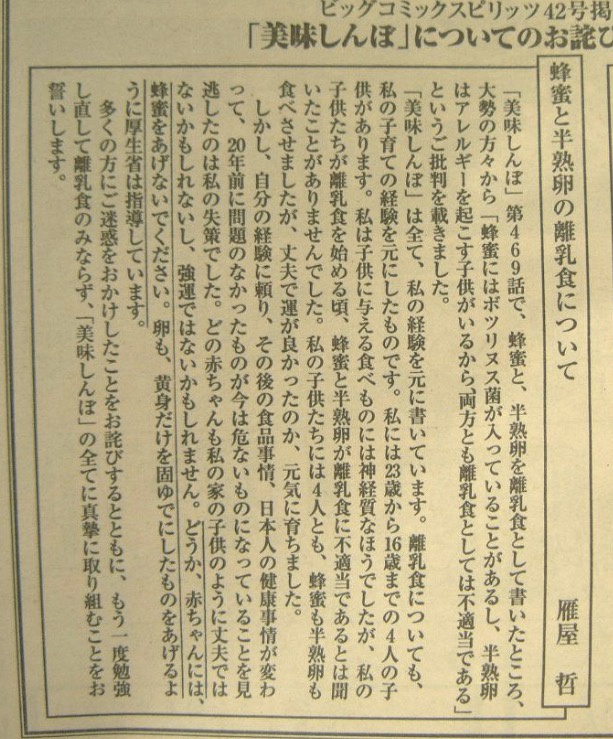 【画像】美味しんぼ作者「赤ちゃんにハチミツあげるのオススメした事を、謝罪します…」