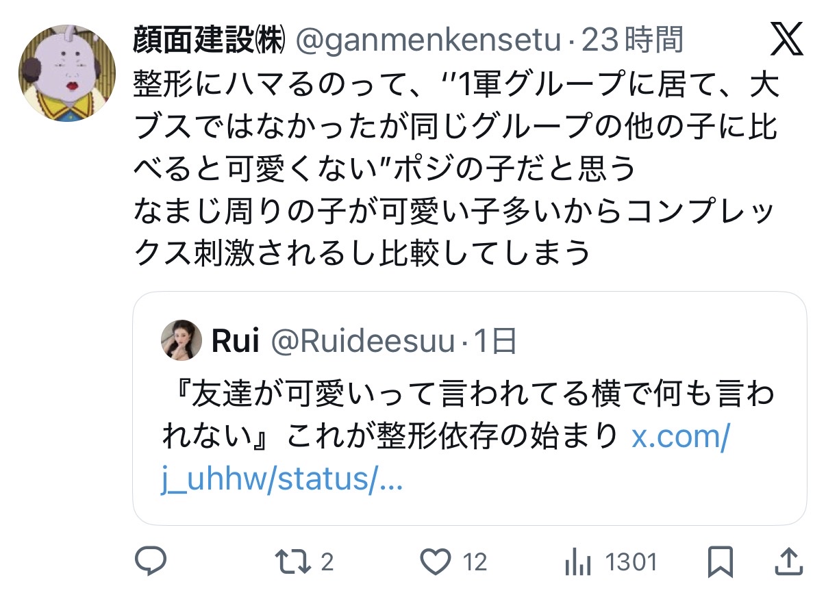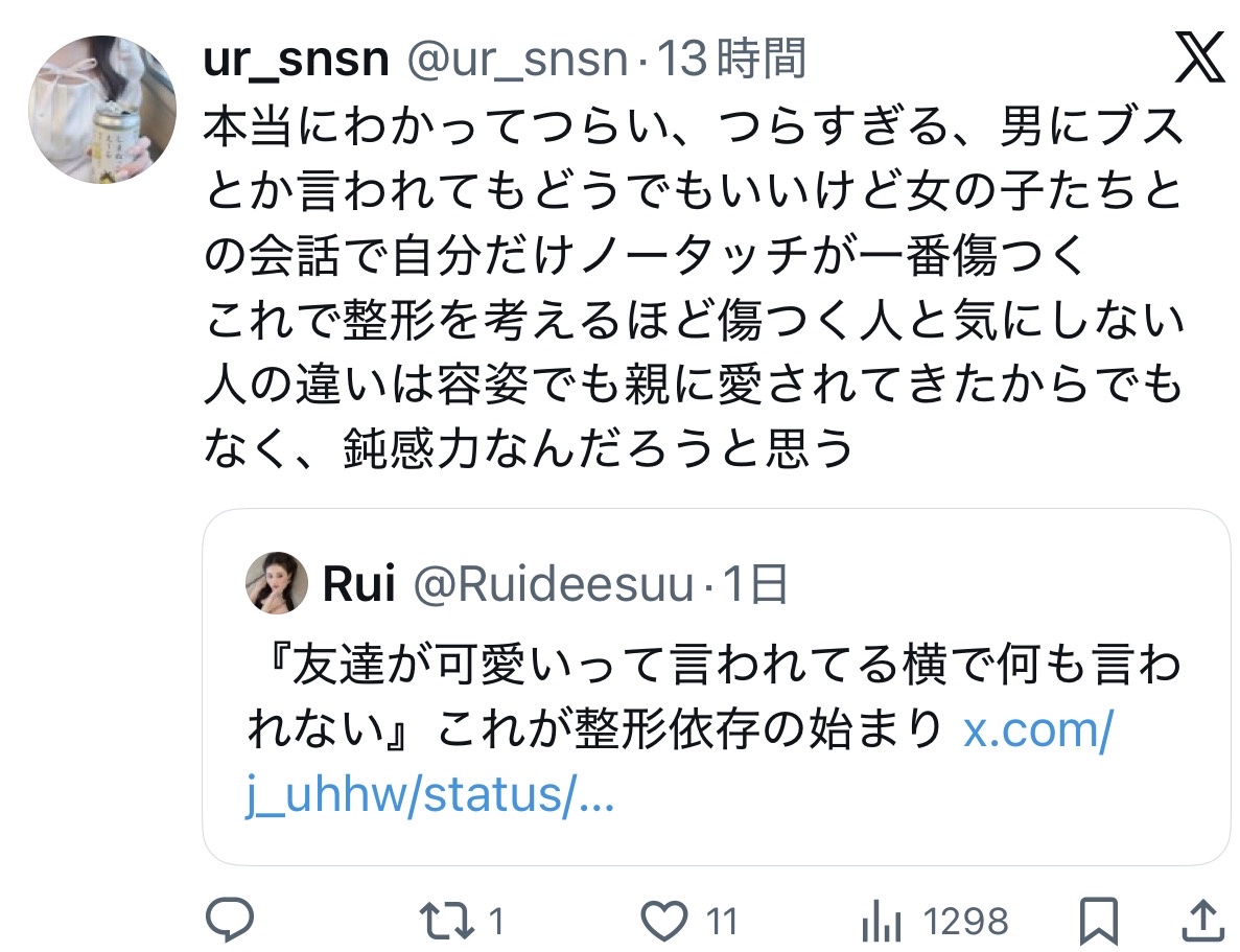 【悲報】女性が整形をする理由、「自分だけ褒められなかった」からだった…