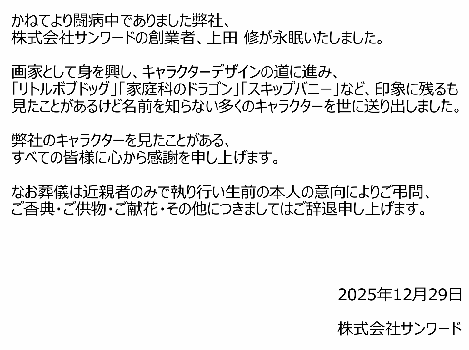 上田修が永眠いたしました。 pic.twitter.com/LVcO9PWEjF— 株式会社サンワード【公式】 (@sunward_info) December 29, 2025