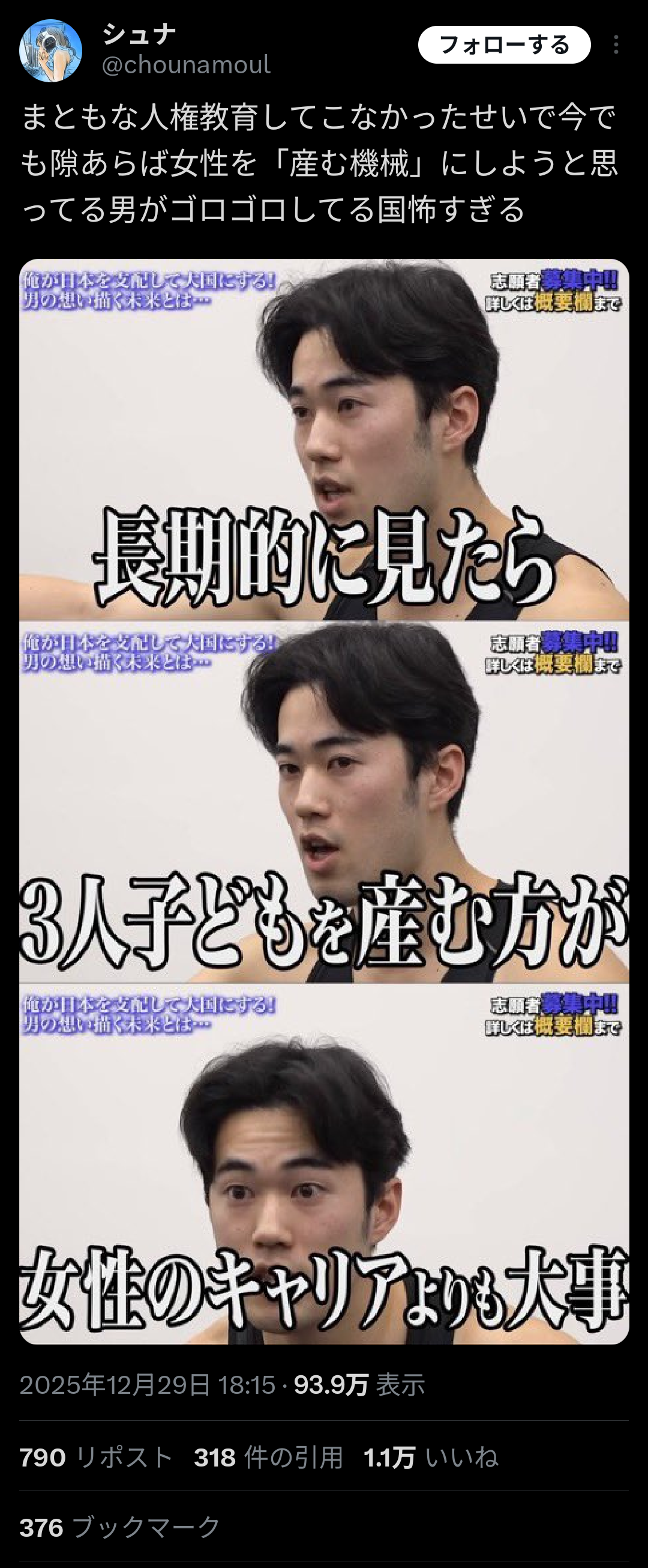 【悲報】男さん「女性は自身のキャリアを築くことより子供を3人生む方が社会的には価値がある」→大炎上