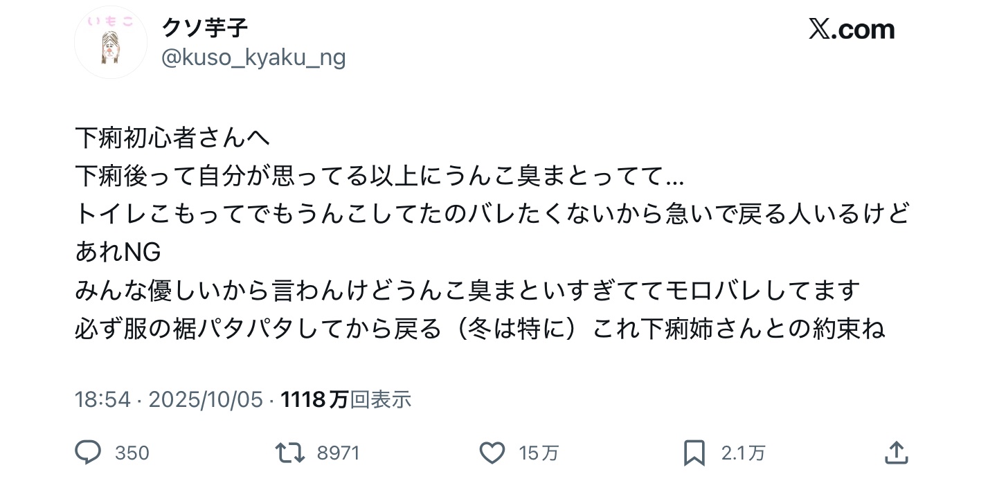 【画像】ネット民の姉さん「トイレで下痢便してる奴!!!下痢便臭纏いすぎて周りにバレてますw」