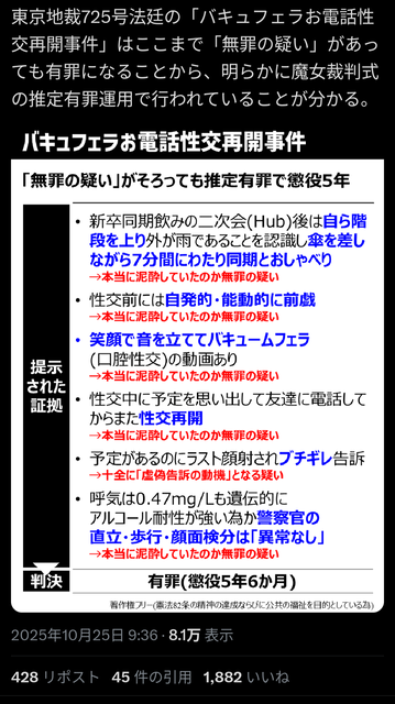 (1) Xユーザーのとある執政官さん: 「東京地裁725号法廷の「バキュフェラお電話性交再開事件」はここまで「無罪の疑い」があっても有罪になることから、明らかに魔女裁判式の推定有罪運用で行われていることが分かる。 https://t.co/L5U0VImzvn」 / X