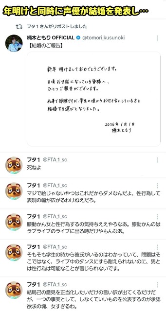 【悲報】穏やかに年越ししていた声優オタクさん、推しの結婚報告で豹変してしまうwwwww