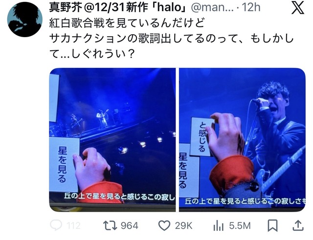 サカナクションの歌詞出してるのって、もしかして…しぐれうい? pic.twitter.com/vaLZlNVdOY— 真野芥@12/31新作「halo」 (@manoakuta) December 31, 2025