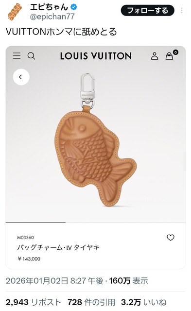 【画像】ルイ・ヴィトンさん、ついに一線を越える。14万円の「たい焼き」がこちらwwww
