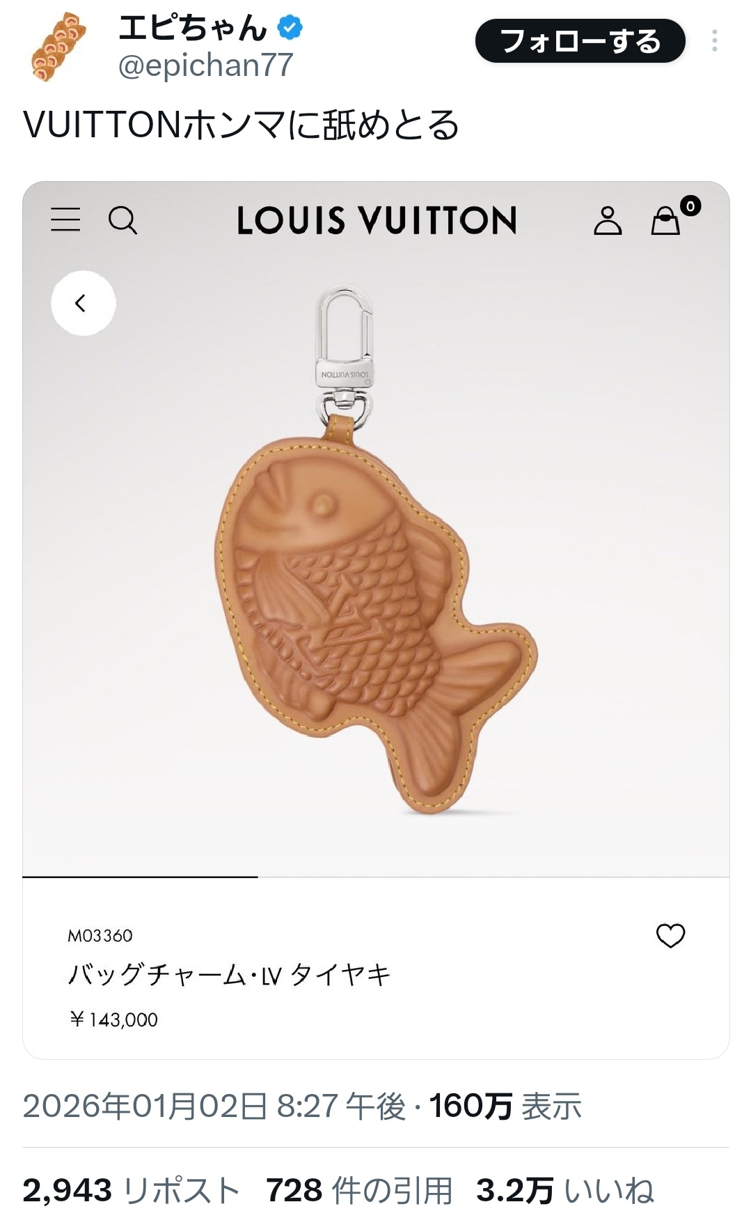 【画像】ルイ・ヴィトンさん、ついに一線を越える。14万円の「たい焼き」がこちらwwww