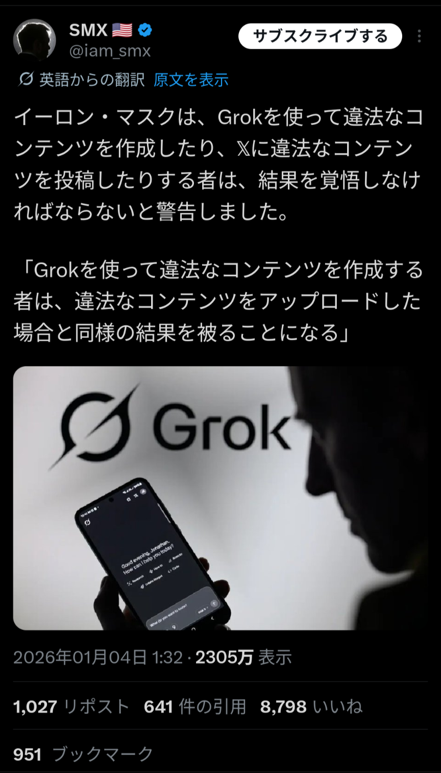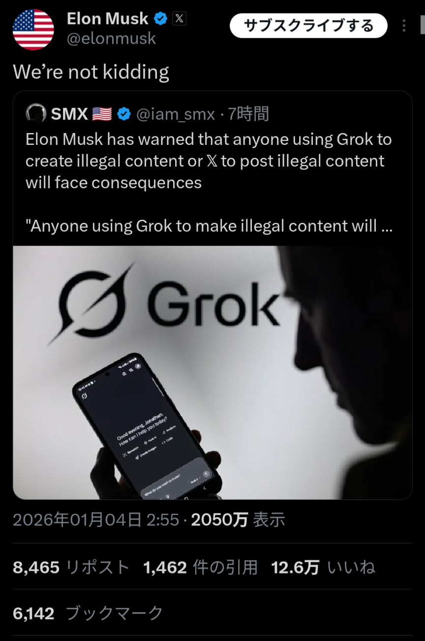 【悲報】イーロン・マスク「grokを使って違法なコンテンツを生成する者は、結果を覚悟しなければならない」