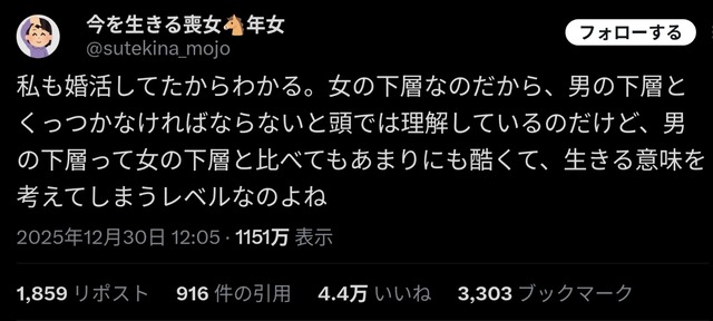 婚活X民「男の下層は女の下層よりレベル低い」→4.4万いいね