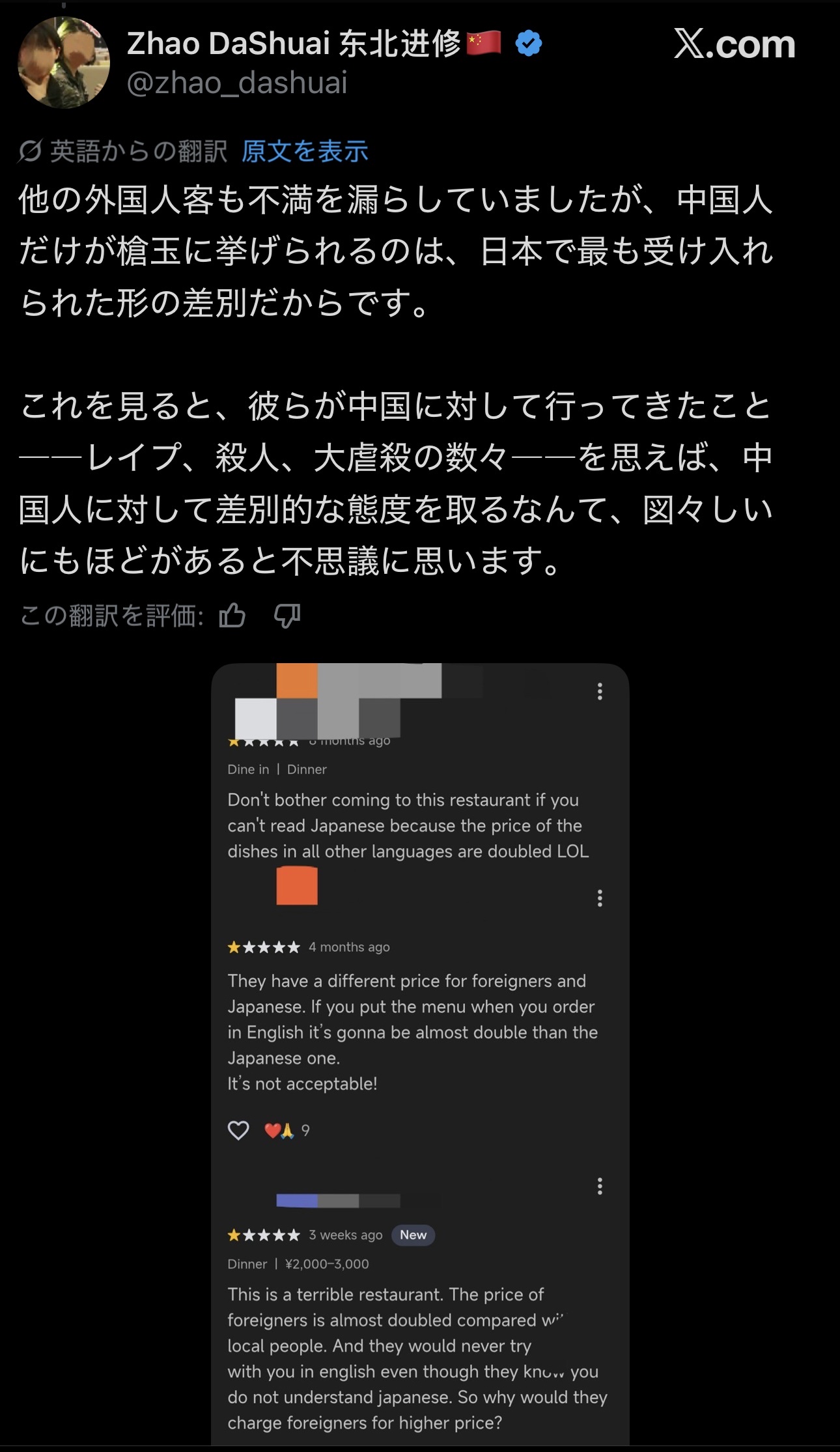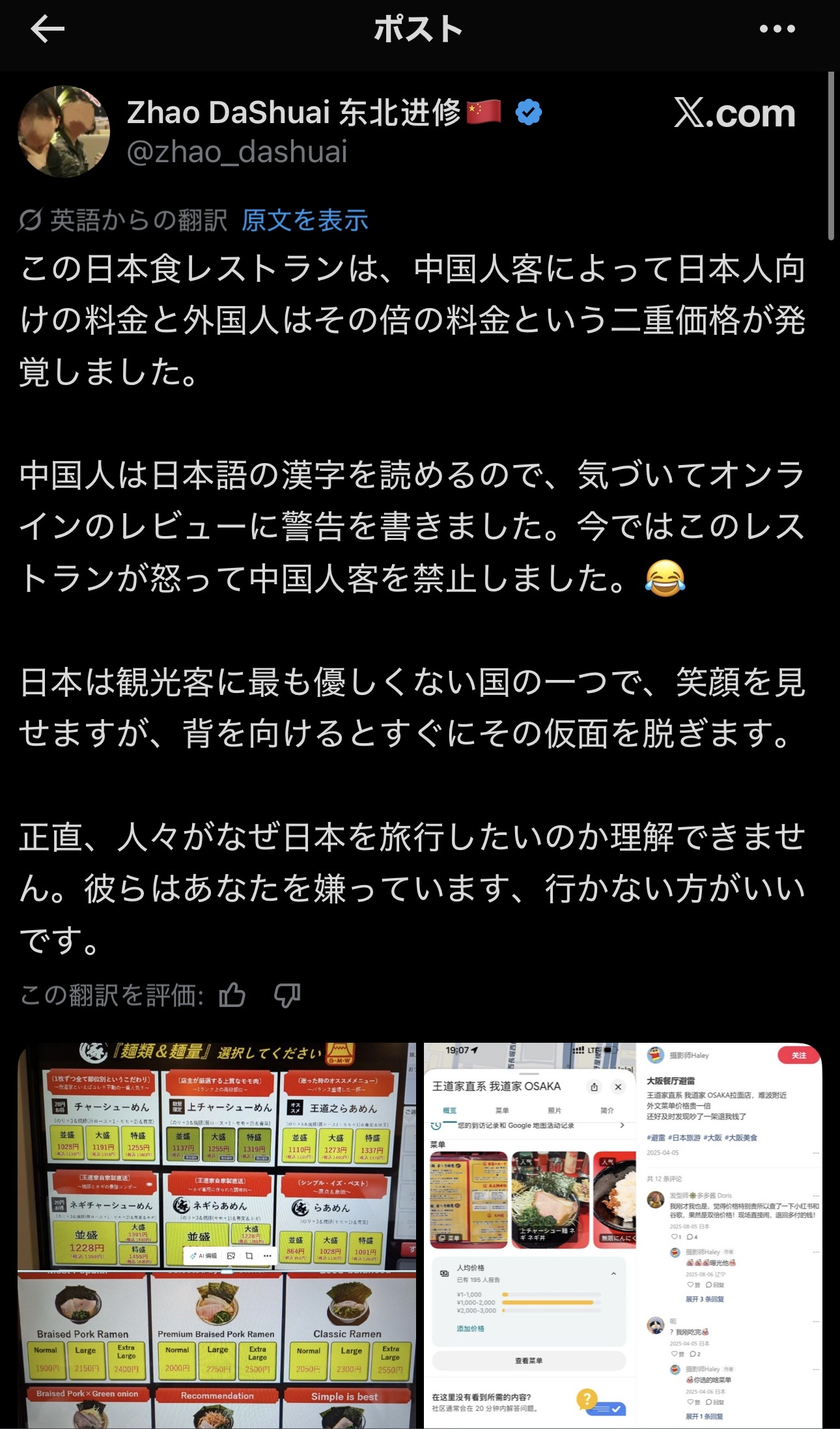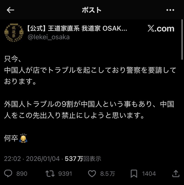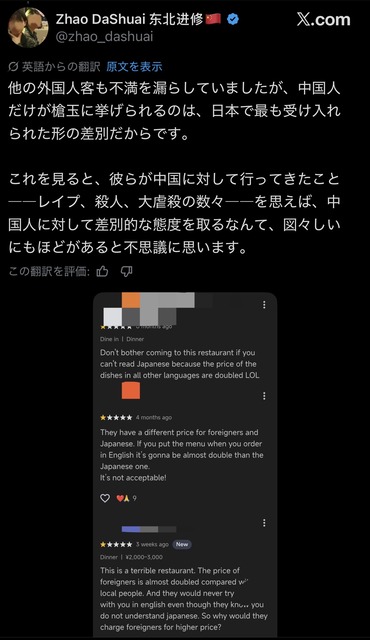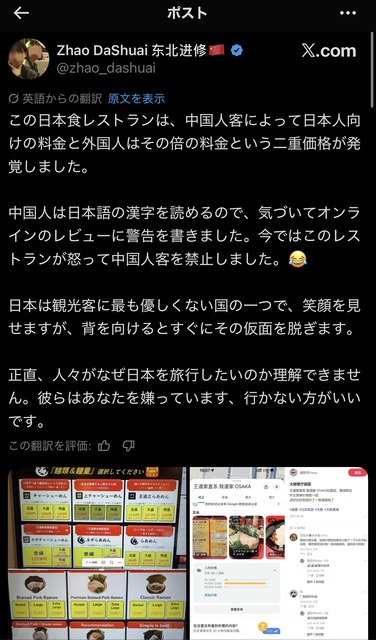 中国人「日本人は差別主義者!二重価格だ!」 ラーメン屋「うるせぇ警察呼ぶぞ!今日からお前ら出禁な」 →