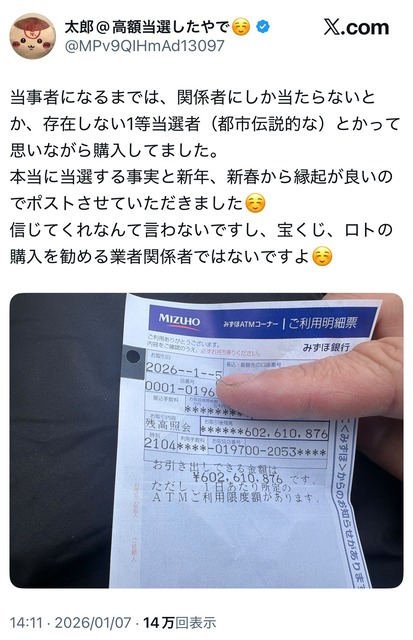 【悲報】宝くじ6億当選者、突然アカウント消滅して姿をくらますwwww