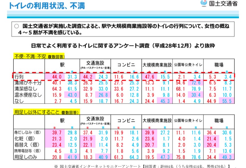 【画像】国交省「男女のトイレを平等にするために男性のトイレの待ち時間を増やします!」