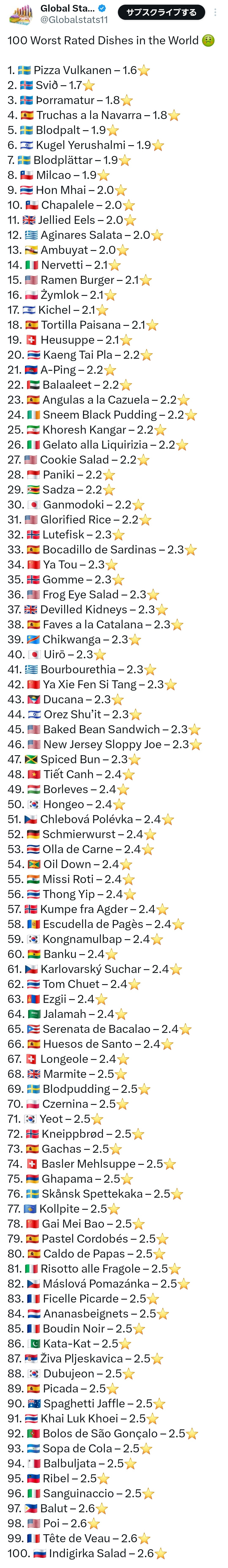 【画像】世界のまずい料理TOP100がこちらwww 2026年1月23日 最終更新日時 : 2026年1月23日 ココナラwordpress 広告エリア 【画像】フジテレビ女子アナ特番、今放送したら完全にアウトwwwwwwwww 【悲報】れいわ大石あきこ、高市早苗を『討論スルーマザー』と揶揄www 『NTE: Neverness to Everness』「共存テスト」参加資格配布および事前DLがスタート、「序章実機プレイデモ」映像も公開! 【画像】ダンスレッスン中のアイドルの胸、エッッッッッッッッッッッッッ! 橋本愛「どうして真っ当なことを言葉にするのに勇気が必要なんだろう?」と反戦に一石を投じる・・・ 【衝撃】結婚したら地獄見る女の特徴wwwwww⇒! 女活動家「女子トイレの数が少なすぎると思いませんか?!💢」 【画像】成人女性「わたし、赤ちゃんだもん・・・・・・」⇒ 3vs3対戦アクション『僕のヒーローアカデミア All’s Justice』2/5本日リリース!有料ダウンロードコンテンツ第1弾のキャラクターも判明 【中革連 】中道改革連合 選挙後に分裂することが判明 【画像】世界のまずい料理TOP100がこちらwww 1:名無し :2026/01/22(木) 08:37:13.504ID:GzA7YjP8M 5:名無し :2026/01/22(木) 08:38:58.792ID:lczenb.Yi がんもどきあかんのか 6:名無し :2026/01/22(木) 08:39:09.408ID:4UoNqfQpx ラーメンバーガーとは 7:名無し :2026/01/22(木) 08:39:21.504ID:bizXBjq3I ういろう美味いやろ 続きを読む 続きを見る(外部サイト) 広告エリア 【画像】フジテレビ女子アナ特番、今放送したら完全にアウトwwwwwwwww 【悲報】れいわ大石あきこ、高市早苗を『討論スルーマザー』と揶揄www 『NTE: Neverness to Everness』「共存テスト」参加資格配布および事前DLがスタート、「序章実機プレイデモ」映像も公開! 【画像】ダンスレッスン中のアイドルの胸、エッッッッッッッッッッッッッ! 橋本愛「どうして真っ当なことを言葉にするのに勇気が必要なんだろう?」と反戦に一石を投じる・・・ 【衝撃】結婚したら地獄見る女の特徴wwwwww⇒! 女活動家「女子トイレの数が少なすぎると思いませんか?!💢」 【画像】成人女性「わたし、赤ちゃんだもん・・・・・・」⇒ 関連記事 【悲報】ブルアカ、安易なエロ売りをファンに叩かれてしまう 【悲報】裏オプで生出しされたお客さん、警察に通報してしまう⇒! 【画像】やけんモテんさん、セクシーグラビアデビュー♡♡♡ 【画像】スーパーでとんでもない寿司を発見したワイ、急遽寿司パーティー開催へwwwwww