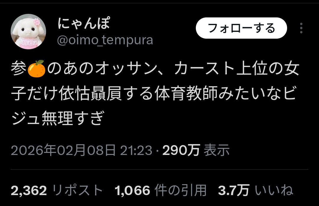 参🍊のあのオッサン、カースト上位の女子だけ依怙贔屓する体育教師みたいなビジュ無理すぎ