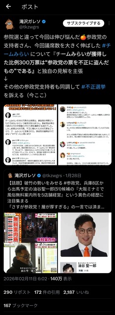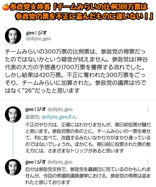 参政党支持者さん、敗因はチーム未来に300万票を盗まれたと騒ぎ出すwww