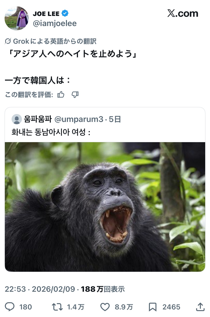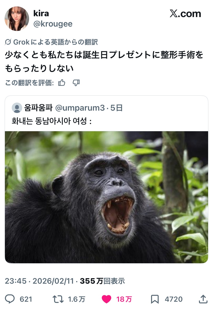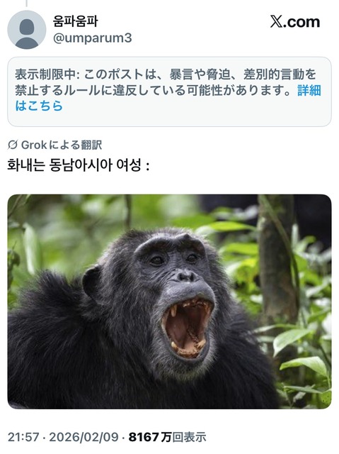 韓国人「お前らは猿だろ💢」(インプ8100万)