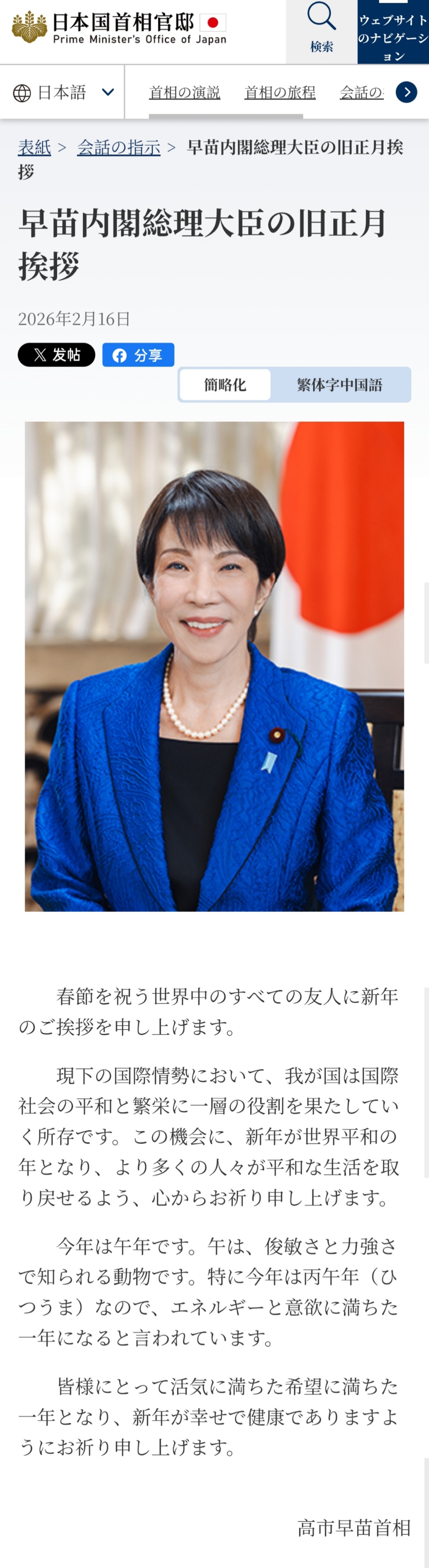 【衝撃】高市首相(おさな)、中国へ「春節の祝辞」で支持者困惑かwww