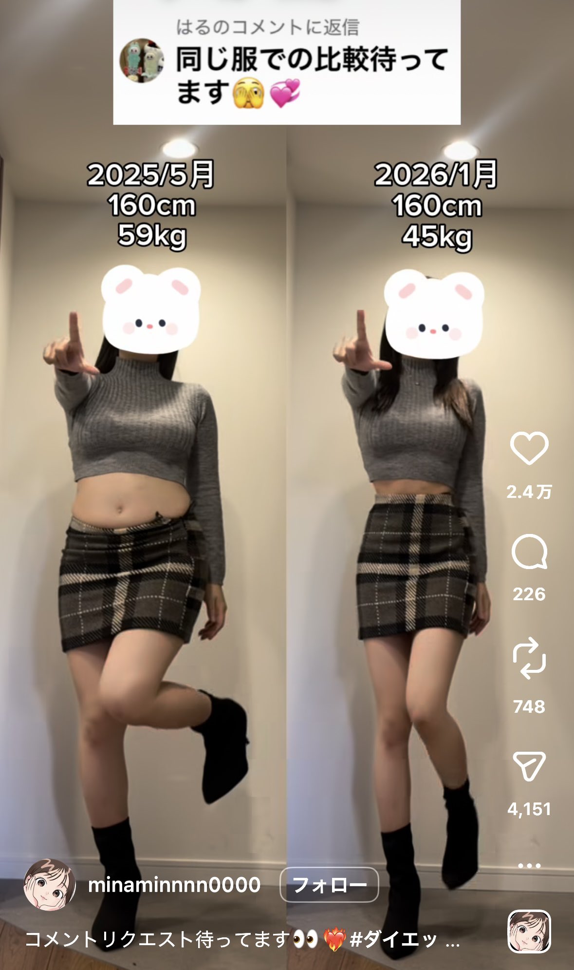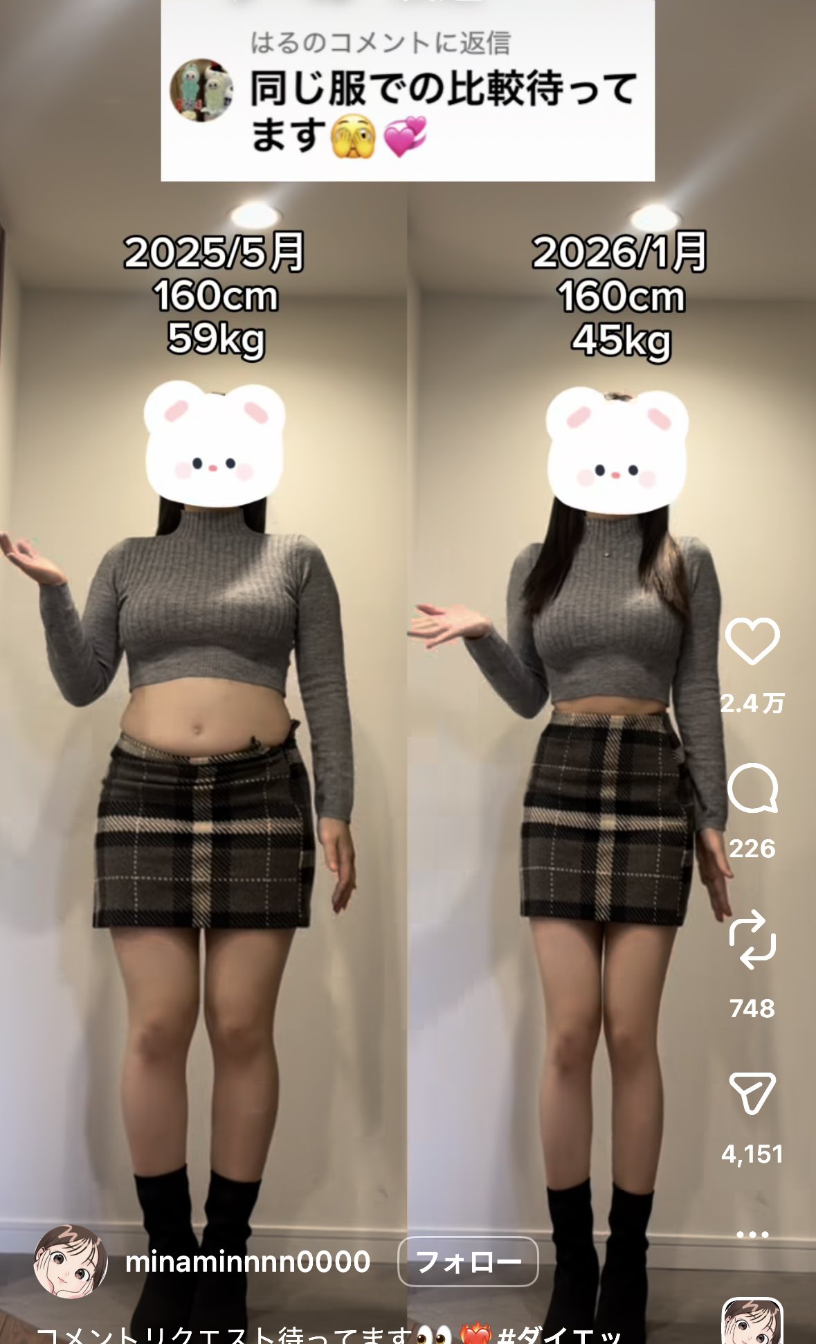 【画像】160cm59→45kgに痩せてバズった女の子の比較画像www