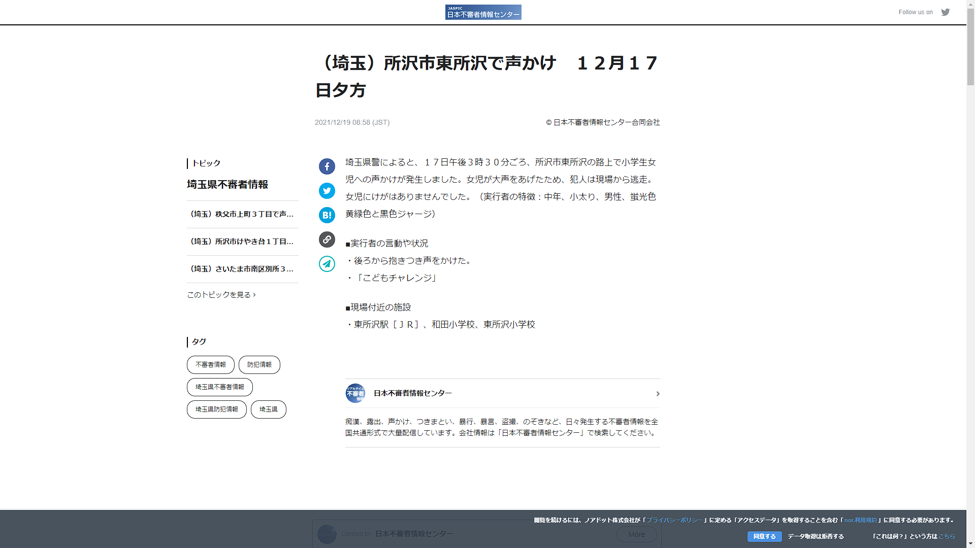 埼玉県警によると、17日午後3時30分ごろ、所沢市東所沢の路上で小学生女児への声かけが発生しました。女児が大声をあげたため、犯人は現場から逃走。