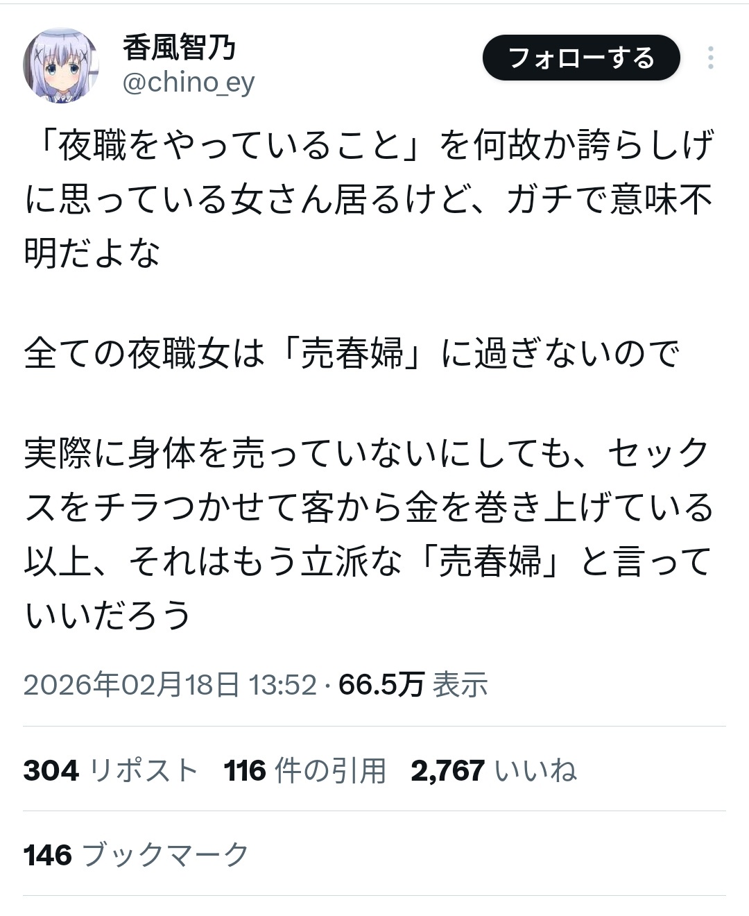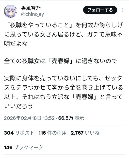 これらも全て本番をしないだけの売春婦なんだけどなぜかこれらは健全な職業側だと思われてるのも意味不明 https://t.co/Uih1qL5ZoD— みいちゃん (@kansei_ga_sugoi) February 18, 2026