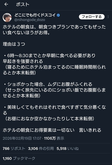 【悲報】人気YouTuber「ホテルの朝食は無駄です!」←これ