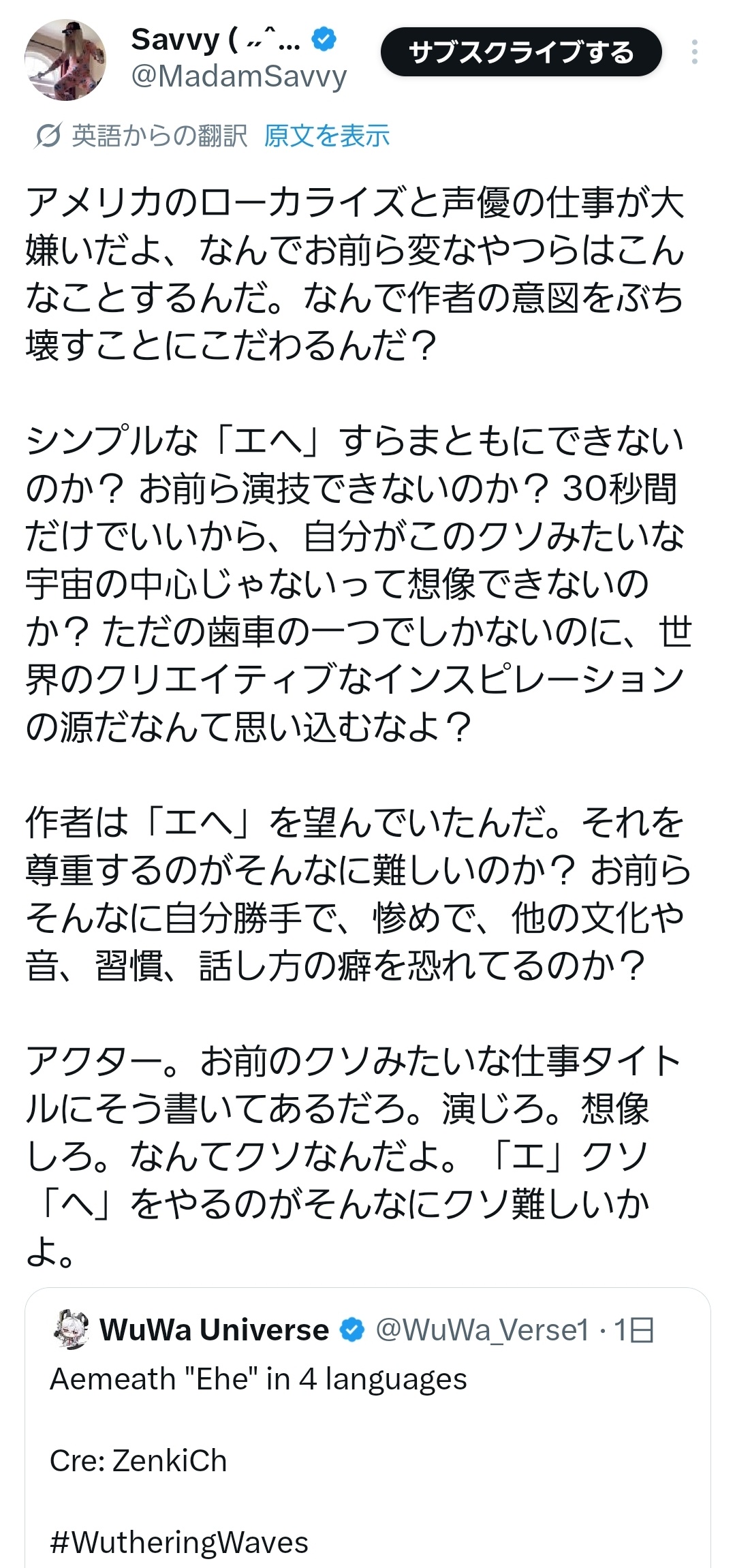 アメリカの翻訳家と声優、「えへ」を訳せず海外オタクに叩かれるwwww