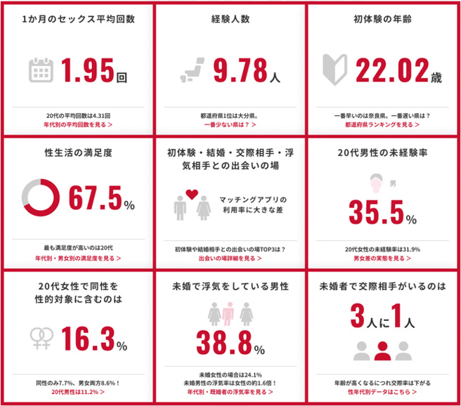 初体験の年齢は全体平均22.02歳(男性23.01歳、女性21.07歳)。都道府県ごとでは、最も早いのが奈良県(21.04歳)、最も遅いのが山口県(23.27歳)となった。