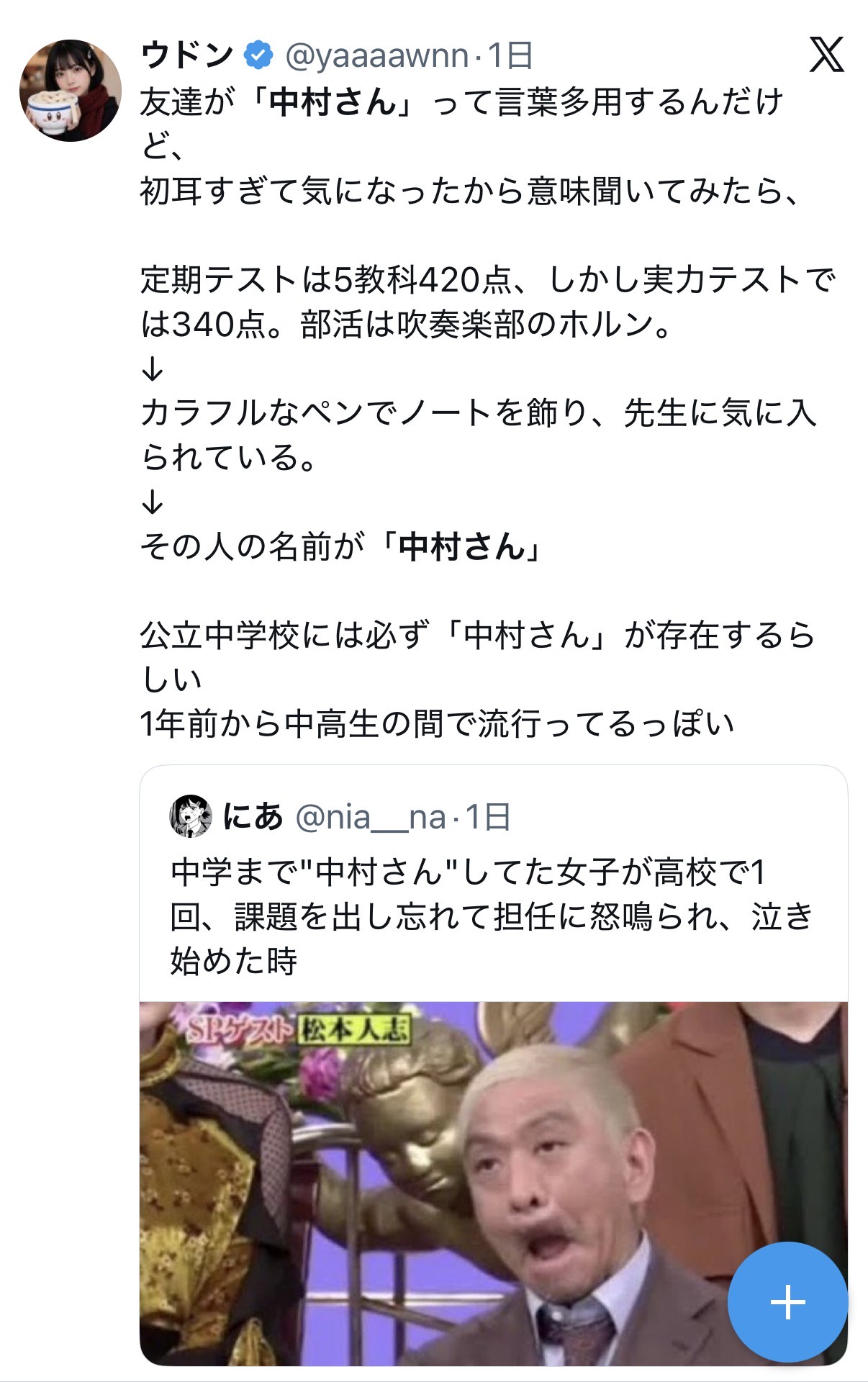 その人の名前が「中村さん」… https://t.co/v2LMkqOYuG— ウドン (@yaaaawnn) March 9, 2026