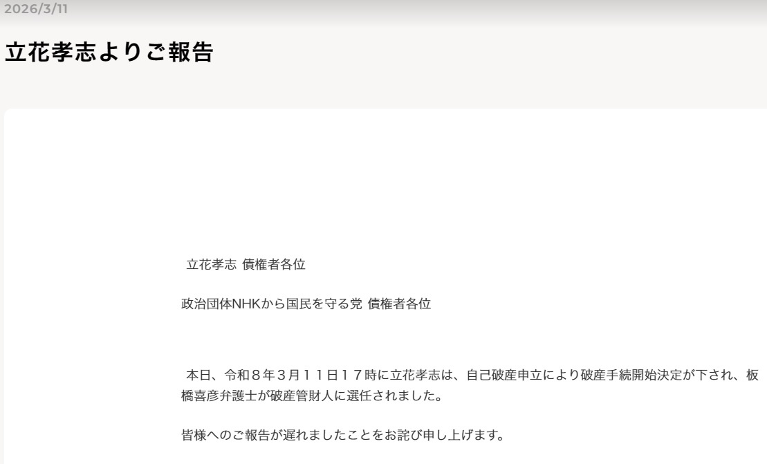 政治団体「NHKから国民を守る党」の党首、立花孝志氏は3月11日、公式サイトで、自己破産の申し立てをおこない、破産手続き開始決定を受けたことを公表した。