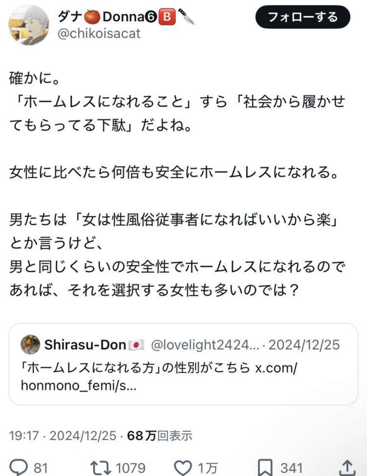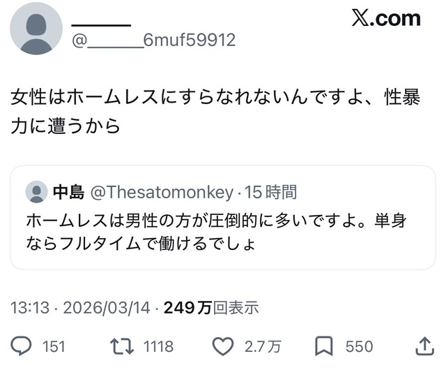 X女「女性は性暴力に怯えてホームレスにすらなれない!」 2026年3月16日 最終更新日時 : 2026年3月16日 ココナラwordpress 広告エリア JKのパンツ見えちゃったんだけお!wwwwwww 【画像】オウムさん、幼女の歯を抜いてしまう・・・・ 美空ひばり「おとうちゃん小林旭がほしい」、山口組三代目組長「よっしゃ!」、昭和ヤバすぎ⇒!! 【画像】ワイ「結局こういう格好の女が一番モテるんよ」 娘(16)「パパと血がつながってるなんて考えただけで吐き気がする!」俺「あっ、お前って母さんの浮気でできた子だから繋がってないよ^^」⇒結果! X女「女性は性暴力に怯えてホームレスにすらなれない!」 【画像】すげぇスタイルのギャル、現るwwwwwwwwww 【画像】沢口愛華の着衣巨胸、エッッッッッッッッッッッ! 【画像】ドンキにスゲー女が現るwwwwwwwwwwwww・・・・・・パシャ!! 彡(^)(^)「え?コーラがこの値段で安い?お前さてはまともに買い物した事ないな?」 X女「女性は性暴力に怯えてホームレスにすらなれない!」 1:名無し :2026/03/15(日) 01:23:11.540ID:ECKicDBBp おおお 2:名無し :2026/03/15(日) 01:23:47.713ID:k7s8apeeQ 勝手になればええやん 4:名無し :2026/03/15(日) 01:23:53.823ID:tMbsnLSuK おるけど 続きを読む 続きを見る(外部サイト) 広告エリア JKのパンツ見えちゃったんだけお!wwwwwww 【画像】オウムさん、幼女の歯を抜いてしまう・・・・ 美空ひばり「おとうちゃん小林旭がほしい」、山口組三代目組長「よっしゃ!」、昭和ヤバすぎ⇒!! 【画像】ワイ「結局こういう格好の女が一番モテるんよ」 娘(16)「パパと血がつながってるなんて考えただけで吐き気がする!」俺「あっ、お前って母さんの浮気でできた子だから繋がってないよ^^」⇒結果! X女「女性は性暴力に怯えてホームレスにすらなれない!」 【画像】すげぇスタイルのギャル、現るwwwwwwwwww 【画像】沢口愛華の着衣巨胸、エッッッッッッッッッッッ! 関連記事 彡(^)(^)「え?コーラがこの値段で安い?お前さてはまともに買い物した事ないな?」 【ガチ】外国人彼女、エロくて優しくてコスパ最強wwww 【画像】すげぇスタイルのギャル、現るwwwwwwwwww 【画像】すげぇスタイルのギャル、現るwwwwwwwwww