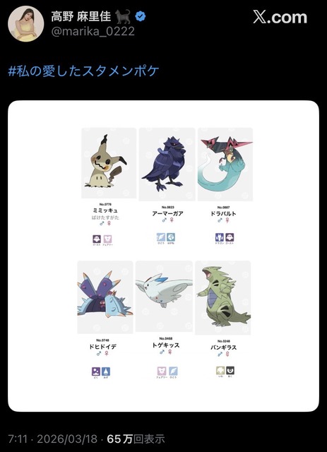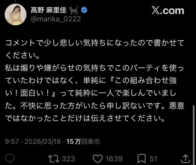 私は煽りや嫌がらせの気持ちでこのパーティを使っていたわけではなく、単純に『この組み合わせ強い!面白い!』って純粋に一人で楽しんでいました。不快に思った方がいたら申し訳ないです。悪意ではなかったことだけは伝えさせてください。— 高野 麻里佳 🐈⬛ (@marika_0222) March 18, 2026