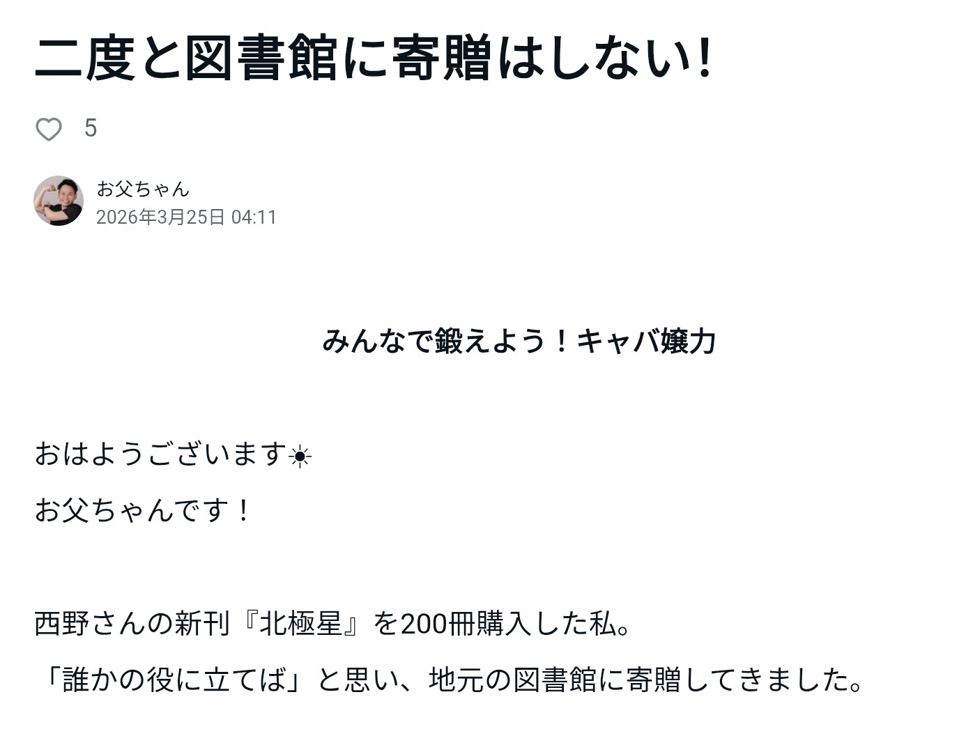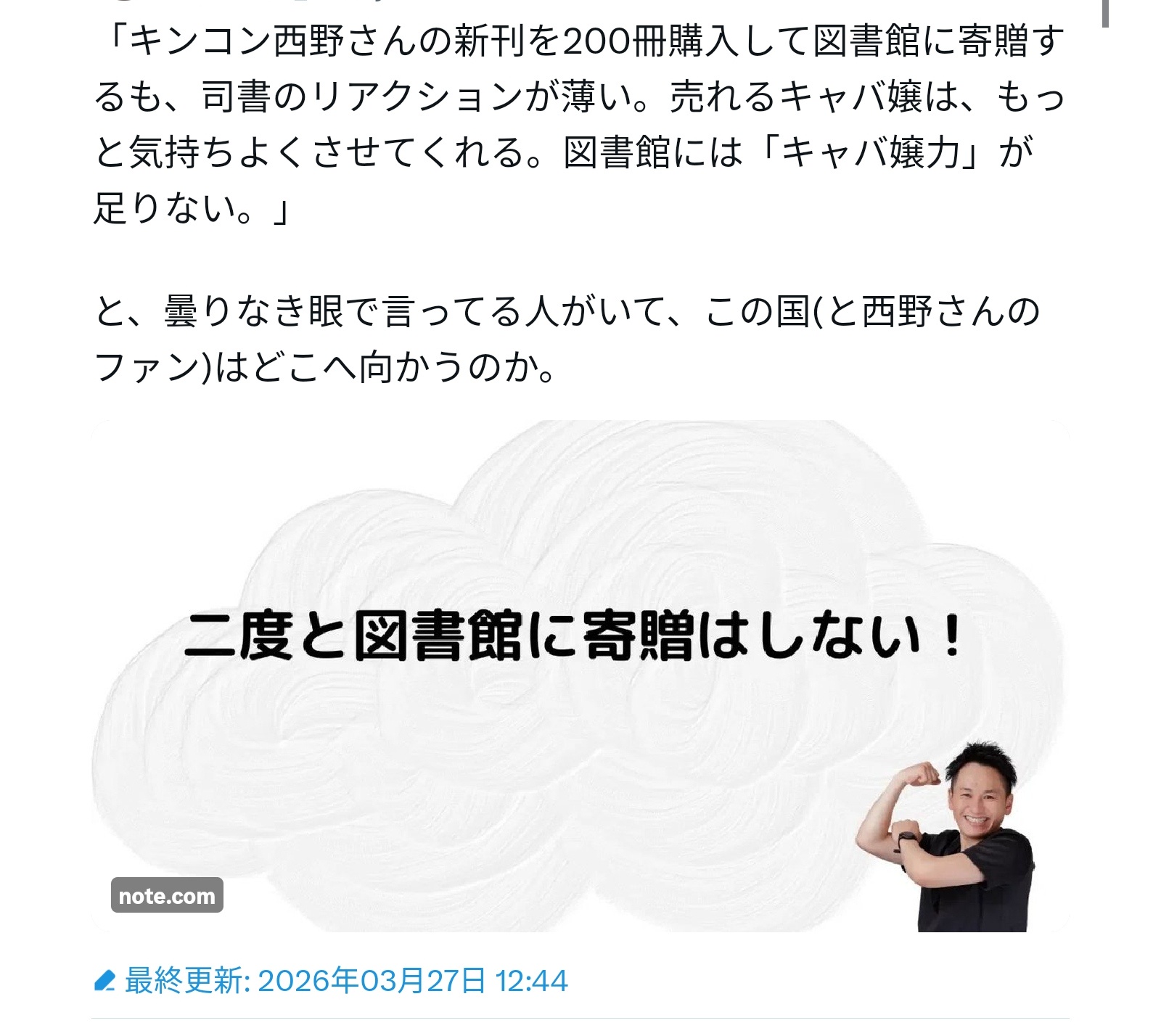 キンコン西野の新刊を200冊買って図書館へ寄贈したおじさん、冷たく対応した司書に「売れてるキャバ嬢を見習え!」