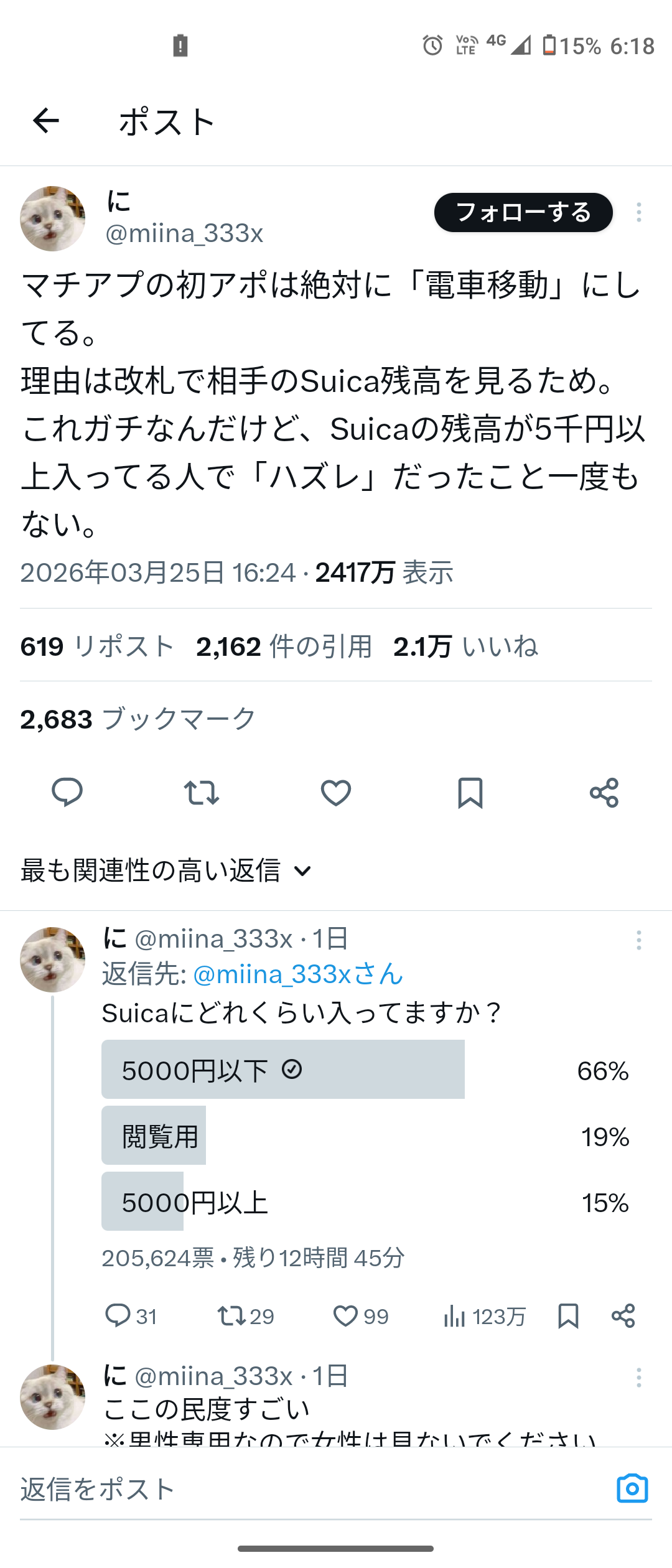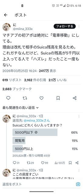 これガチなんだけど、Suicaの残高が5千円以上入ってる人で「ハズレ」だったこと一度もない。— に (@miina_333x) March 25, 2026