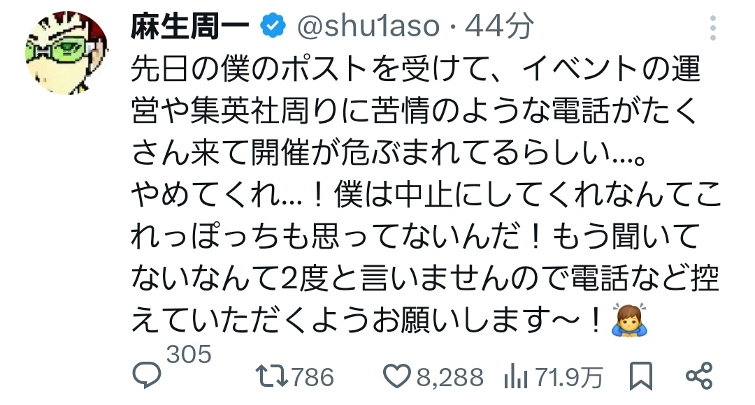斉木楠雄の作者、自分の知らないうちにイベントが開かれる事をXでお気持ちした結果、中止になりそうで焦るwwww