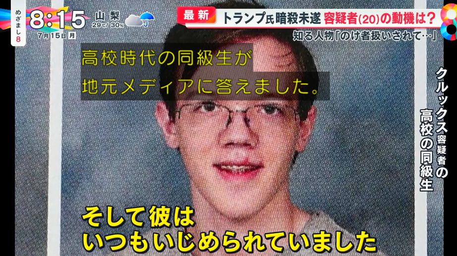 容疑者は介護施設勤務、成績優秀 友人少なく、いじめ証言も(中略)米メディアによると、トランプ前大統領暗殺未遂事件のトーマス・クルックス容疑者(20)は介護施設で働き、高校時代は理数系科目の成績優秀者として表彰される一方、友人は少なく、いじめられていたとの証言もある。射撃部に入ろうとしたこともあったという。続きはこちら