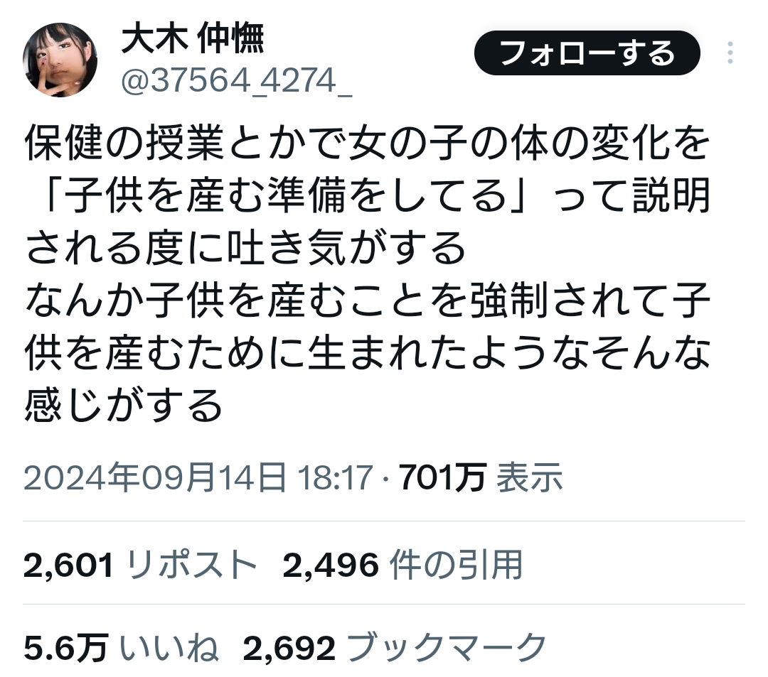 なんか子供を産むことを強制されて子供を産むために生まれたようなそんな感じがする— 大木 仲憮 (@37564_4274_) September 14, 2024
